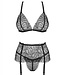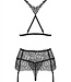 Verleid je partner in deze 3-delige jarretel set van Obsessive! Deze set bestaat uit een BH met soft cups, een jarretelgordel en een bijpassende string. De BH bandjes en jarretelbandjes zijn beide verstelbaar. De set laat je billen geheel vrij voor een spannende look. Maak je outfit af met een paar bijpassende jarretel kousen.